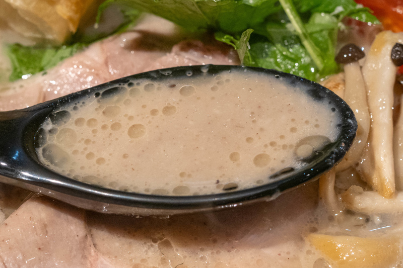 (以前と同じ印象はコピペ) 白茶濁のとろみのあるスープは、キノコポタージュ×濃厚豚骨スープ。 キノコの旨味がたっぷりのスープに、トリュフオイルの芳醇で高級感のある香りで、とても美味しい。 麺は、中華そばに使用している太めの平打ちで、手揉みを加えていないストレート。 ツルツルとした啜り心地に加え、もち麦を50%使用したことで生まれる強い弾力とモチッとした食感が魅力。 小麦の甘みもしっかり感じられ、スープとの相性も抜群。 キノコポタージュスープと合わせると、パスタに近い食感に感じられる。 (村上朝日製麺) チャーシューは炭火で焼き上げた豚肩ロースが2枚。 炭火の香ばしさが旨味を引き立て、脂はほどよく入り、しなやかで上質な仕上がり。 自家製のパイは焼きたてだそうで、ふっくらと香ばしい。 キノコポタージュスープに浸しても抜群に美味しい。 その他の具は、キノコ(シメジ、エリンギ)のソテー、プチトマト、ベビーリーフ。 この限定メニューのために、丼を新調したのだそう。 手が込んでいて、レベルの高い洋風ラーメン! |