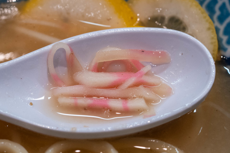 都度、小鍋であんかけを作るので熱々。 香りが高く、旨味たっぷり。 クッキリとした塩味で、ほんのりと胡椒が効いている。 甘酢漬けの茗荷と、レモンの柑橘系の香り・酸味が味変アイテム。 スッキリとして最後まで食べやすい。 麺は断面が丸い太麺、160g。 適度な硬さの茹で上げで、ツルツルと滑らかでモチモチとした食感。 スープとの相性が良い。 (「鈴めん」のはず) チャーシューは、厚めのカットの肩ロースが2枚で、肉の旨味がある。 茗荷は甘酢漬けで、味変としてちょうど良い。 レモンスライスは、柑橘系の香り・酸味が味変となる。 青菜はシャキシャキとした食感。 その他の具は、ナルトの細切り。 レベルの高い限定メニュー 冬の限定でもう一度食べてみたい! |