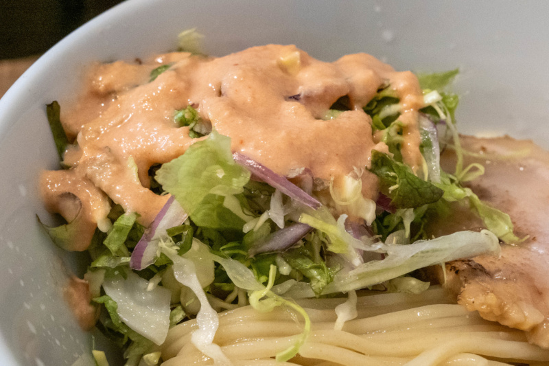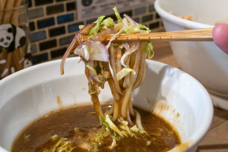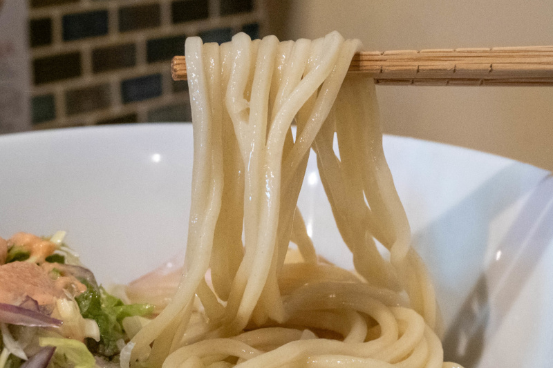ツルツル、もちもちの太麺がよく合います。 |