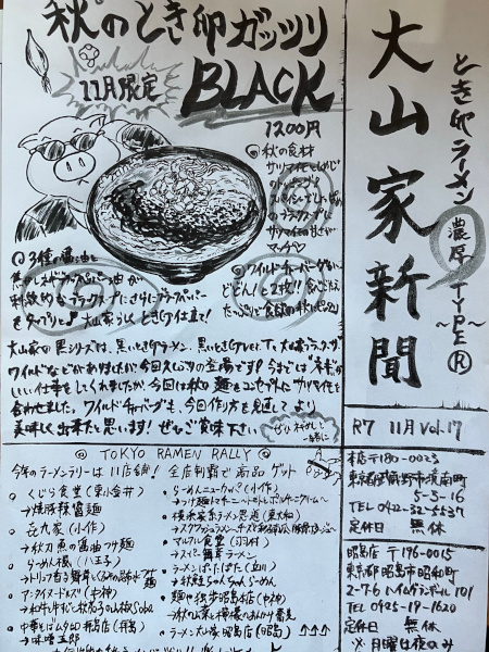 大山家新聞 Vol.17 R7.11月 (画像は公式Xから引用) 11月限定 秋のとき卵ガッツリBLACK 1200円 ▶ 秋の食材 サツマイモとしめじのトッピング! スパイシーでしょっぱめのブラックスープに、サツマイモの甘さがマッチ ▶ 3種の醤油と焦がしネギブラックペッパー油が刺激的なブラックスープに さらにブラックペッパーをたっぷりと大山家らしくとき卵仕立て! ▶ ワイルドチャーバーグはどどん!と2枚!! 食べ応えたっぷりで食欲の秋にピッタリ 大山家の黒シリーズは、黒いとき卵ラーメン、黒いときVer、大山家ブラック・ザ・ワイルドなどがありましたが、今回久しぶりの登場です! 今まではネギがいい仕事をしてくれましたが、今回は秋の麺をコンセプトにサツマイモを合わせました。 ワイルドチャーバーグも、今回作り方を見直して、より美味しくできたと思います! ぜひご賞味下さい。 |