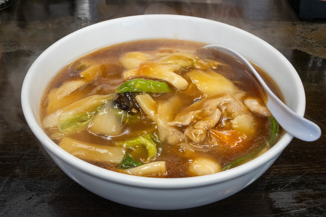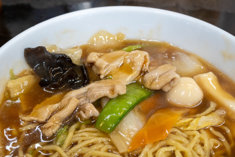 チャーシューは入っておらず、海老、野菜、キクラゲなど |