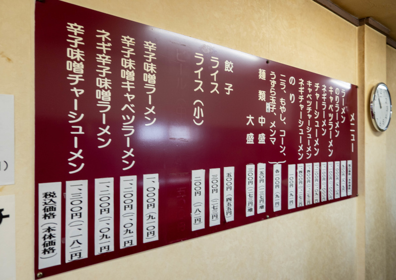 ラーメン 900、のりラーメン 1000、キャベツラーメン 1100、ネギラーメン 1100、チャーシューメン 1200、キャベツチャーシューメン 1400、ネギチャーシューメン 1400 辛子味噌ラーメン 1000、辛子味噌キャベツラーメン 1200、ネギ辛子味噌ラーメン 1200、辛子味噌チャーシューメン 1300 中盛 +150、大盛 +300 のり・半熟味付け玉子・ニラ・もやし・コーン・うずら玉子4個・メンマ 100 餃子 500 ミニチャーシュー丼(辛子味噌キャベツ丼・ネギチャーシュー丼) 400、ライス 300・小 200