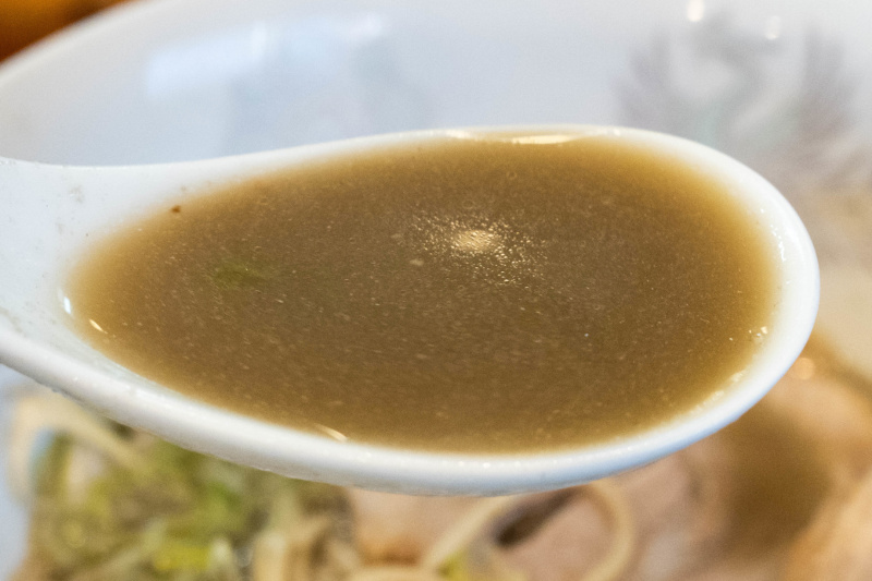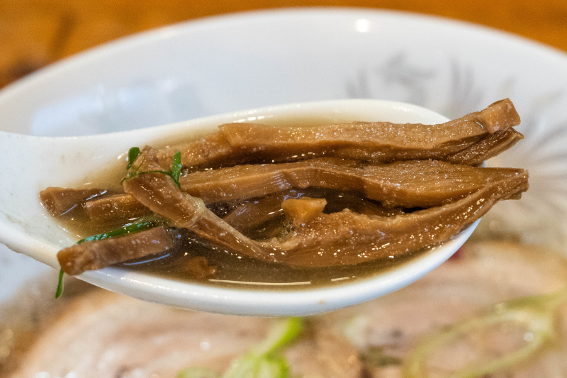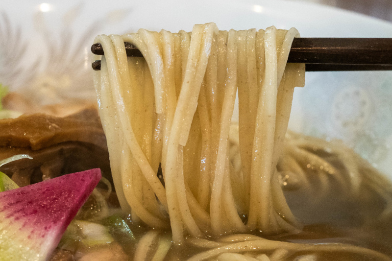 灰色を帯びた茶褐色のスープは煮干しがガッツリ。 えぐみやビター感はほぼ感じず、煮干しの旨味だけを濃縮しているような印象。 いわゆるセメント系だが、とろみはなくサラッとしている。 煮干しからの塩分も出ているようで、塩味はやや強めだが食べやすい。 旨味は強いがベタつきがないのが無化調ならでは。 柚子皮の柑橘系の香りが味変アイテム。 麺は細麺ストレート麺。 ホシが練り込まれているので、全粒粉も使っているかもしれない。 加水が低めでサクッとした歯切れ感がある。 強めのスープに対しての存在感がある。 小麦の香りと甘味があり、麺そのものが美味しい。 (自家製麺) チャーシューはバラ肉ロールの煮豚が2枚。脂の甘みと肉の旨味を堪能できる。 メンマはコリッとして風味が良い。 その他の具は、紅芯大根。 薬味は、長ネギの白い部分の笹切り。 濃縮した煮干しを堪能できる! |