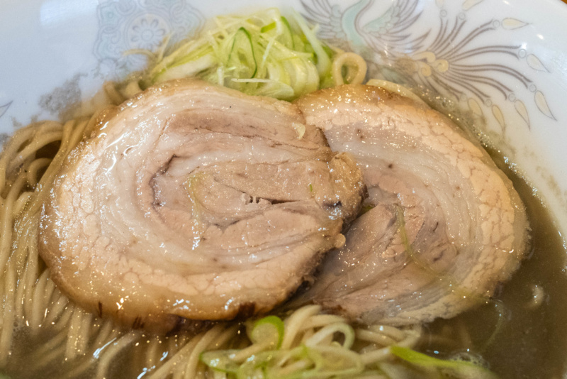 『お肉がメインの冷やし中華』とのこと。 麺は太い手揉み麺。 水で〆てあり、ツルッと滑らかで、プルッ・モチッとした弾力のあるモッチリとした食感。 小麦の香りが心地よいので、麺そのものが美味しい。 (自家製麺) 麺を丼の底にある内堀醸造の黒酢を使用したタレとよく混ぜて食べる。 まろやかな酸味と旨味のタレは多少のピリッと感があって美味しい。 チャーシューは諫美豚(かんびとん)の、分厚いカットのバラが2枚で、1枚はロールタイプ。 自家栽培したお米を与えて飼育しているためか、クセがなくスッキリとした旨味がある。 直前に炭火で炙ってあるので、香ばしさがプラスされてさらに美味しい。 冷やしワンタンは、海老ワンタン・肉ワンタンが1個ずつで、冷やしても美味しい。 夏野菜の焼き浸しは、パプリカ、南瓜、茄子、オクラ、茗荷。野菜の食感と旨味を残してある。 その他の具は、キュウリの千切り。 『お肉がメインの冷やし中華』というコンセプトが良くわかる 食べたこがない肉の美味しさ! |