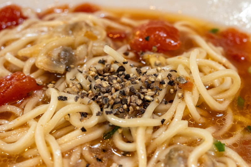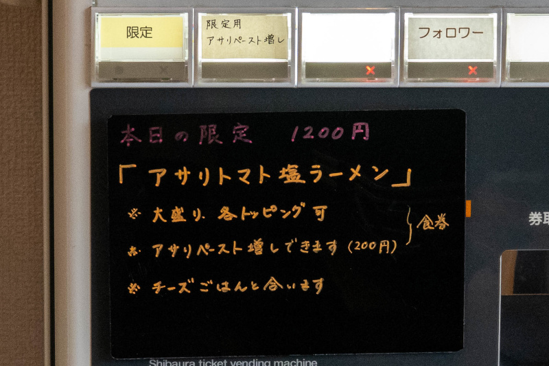 (限定) アサリトマト塩ラーメン + アサリペースト増し [2025/10/11] ¥1200+¥200 2025/10/10からの限定40食提供 【お店からの告知(要約)】 ※可能 大盛り、替え玉、麺半分、各種トッピング追加、各種トッピング無し(アサリペースト無しは不可)