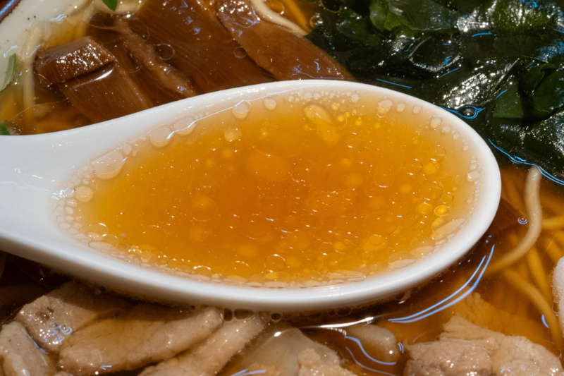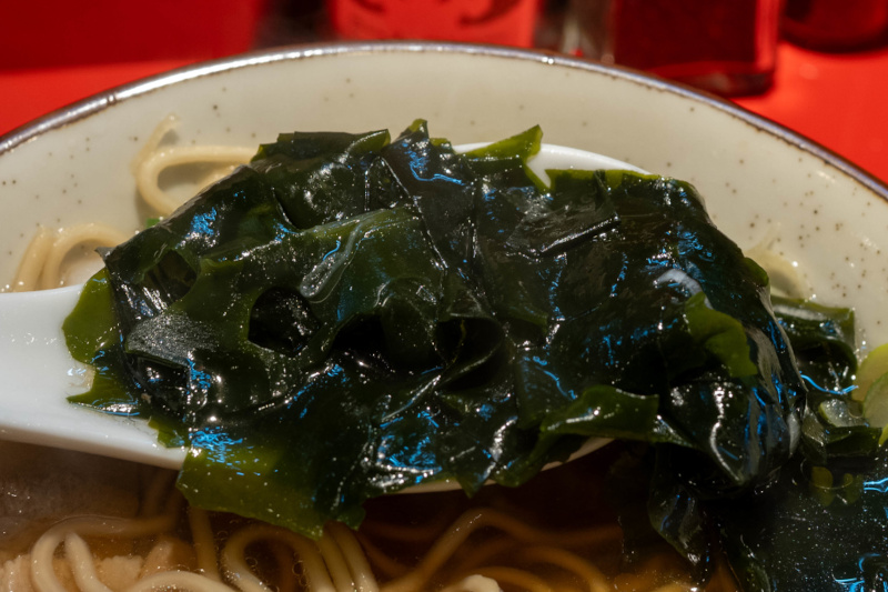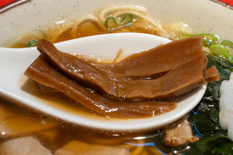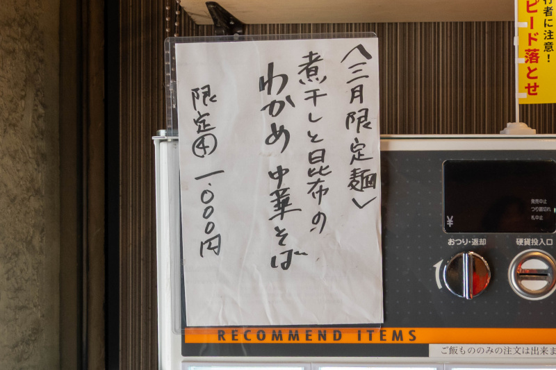 (限定) 煮干しと昆布のわかめ中華そば [2026/3/7] ¥1000 2026/3/7からの 3月限定メニュー 熱々の透き通った醤油スープは、立ち上がる湯気と共にどこか懐かしい香りを運んでくる。 煮干しと昆布のダシ感は決して突出せず、穏やかでバランスを重視した、じんわりと体に染み入るような優しい味わい。 表面を覆う油は少なめで、スープの素朴な風味が真っ直ぐに伝わる昔風の趣がある。 自家製の細麺は軽くウェーブがかり、適度な硬さを残した茹で上げが心地よい。 少しボソッとした食感が、優しく穏やかなスープと絶妙に響き合う。 添えられたナルトと共に素朴な懐かしさをより鮮明にしている。 たっぷりと盛り付けられたわかめからは、次第に豊かな磯感が染み出し、食べ進めるごとにスープの表情を徐々に変えていく。 チャーシューの代わりのバラ肉は、噛み締めるほどに肉の旨味が溢れ、スープにいっそうの深みを添えている。 メンマは平打ちの濃い色調で、コリッとした快い食感と風味がアクセントとして利いている。 後半は卓上の一味唐辛子をパラリ。ピリッと引き締まった味わいへと変化し、最後の一滴まで飽きさせない。 確かな満足感と安らぎを与えてくれる、春を待つ季節にふさわしい、心まで温まる限定麺。 |