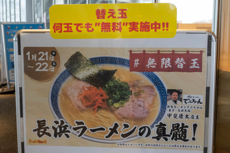 【博多ラーメン でぶちゃん】 長浜ラーメンの真髄! 2026/1/21・22の出店 [2026/1/21] 長浜ラーメン 1200 [2026/1/21]・茹で卵入り 1300・ネギ増し 1400・肉増し 1600 替え玉 無料 明太子ごはん 500 店主との記念写真券 無料 ラーメンWalker2026 カレンダー 2000 アサヒ生 ジョッキ缶 450、レモンサワー・ハイボール 400 紹興酒 700、グラスワイン 赤/白 500 (ノンアルコールビール)アサヒドライゼロ 300 コカコーラ・オレンジジュース 200、黒烏龍茶 300