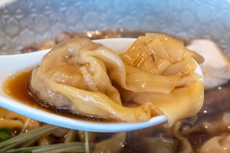 ワンタンは、イベリコ豚の肉ワンタンが2個。皮は小さめで、肉の旨味がたっぷり。(特製のみ)