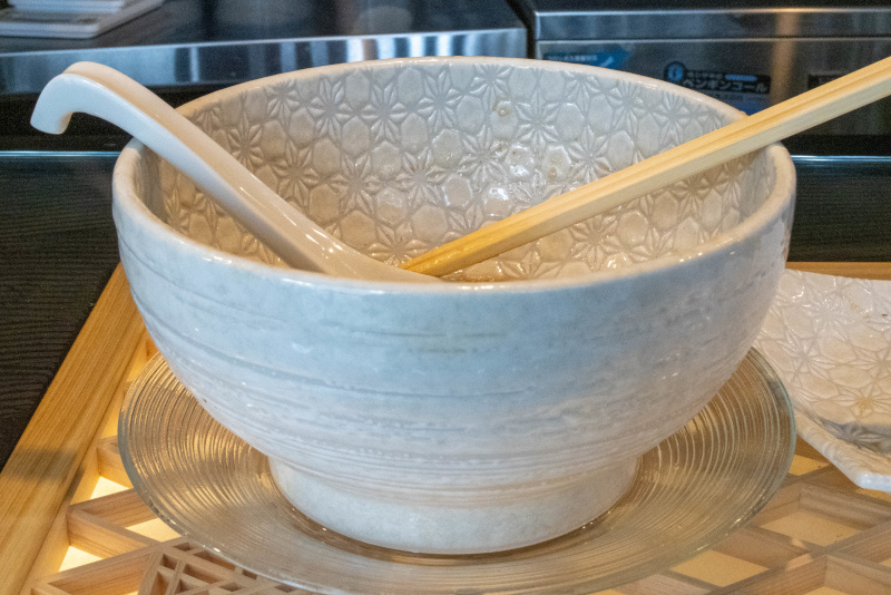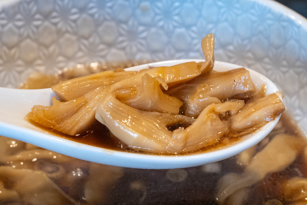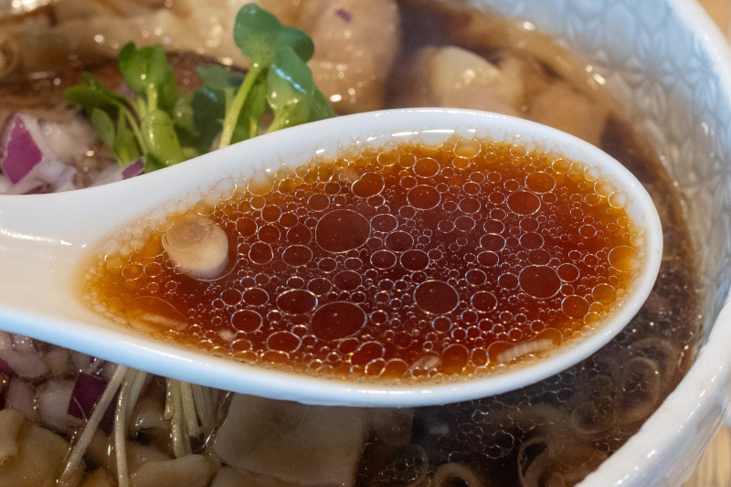 ピロピロとした口当たりに加えて、たぶんもち小麦使用のモチモチ感と、薄めの部分のトロッと感のコントラストがあり、スープとの相性が抜群に良い。