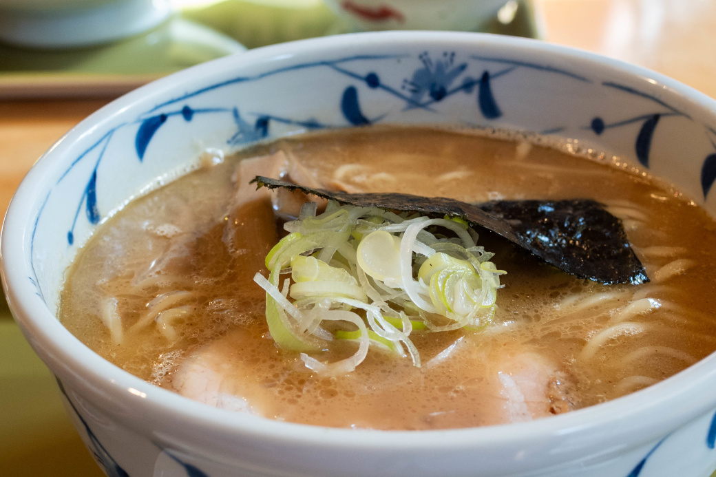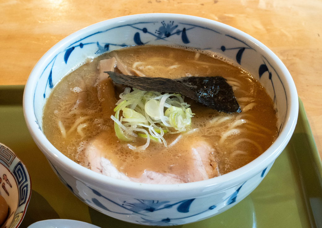中華そば [2025/10/3] ¥1100 (前回と同様の感想はコピペ) 暖簾、トレイ、箸とも緑色系で統一されている。 動物系に煮干しや鰹節などの和風乾物を合わせたWスープ。 表面には薄く膜が張るほどコラーゲンが溶け出している。 濃厚ながら重さは控えめで、最後まで飽きずに食べ進められるバランス。 無化調でも旨味は十分で、物足りなさは感じない。 味付けは醤油ベースで、ほどよい甘みとまろやかさ、芳醇な風味が広がる。 表面の油はほとんどなく、後味は軽やか。 卓上の胡椒、ラー油を加えると、また違ったアクセントが楽しめる。 麺は中太のストレート。 適度な硬さの茹で加減で、なめらかな表面ともちっとした食感。スープとのなじみも良い。 小麦はニップン北海道産100%、浅野さん家の卵を使用。 麺量は200gと、しっかりしたボリューム。 (自家製麺) チャーシューは下田さん家の豚を使ったバラロールの厚切り。脂の甘みと肉の旨味がバランスよく感じられる。 メンマは熟成タイプで、コリッとした歯切れと風味の良さが印象的。 薬味は長ネギの白い部分の小口切り。 懐かしさのあるWスープ 丁寧さがあり満足度が高い! |