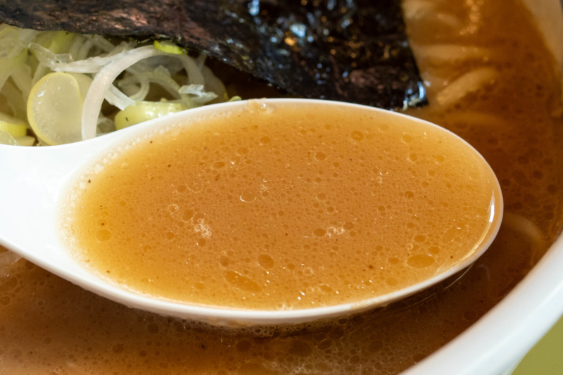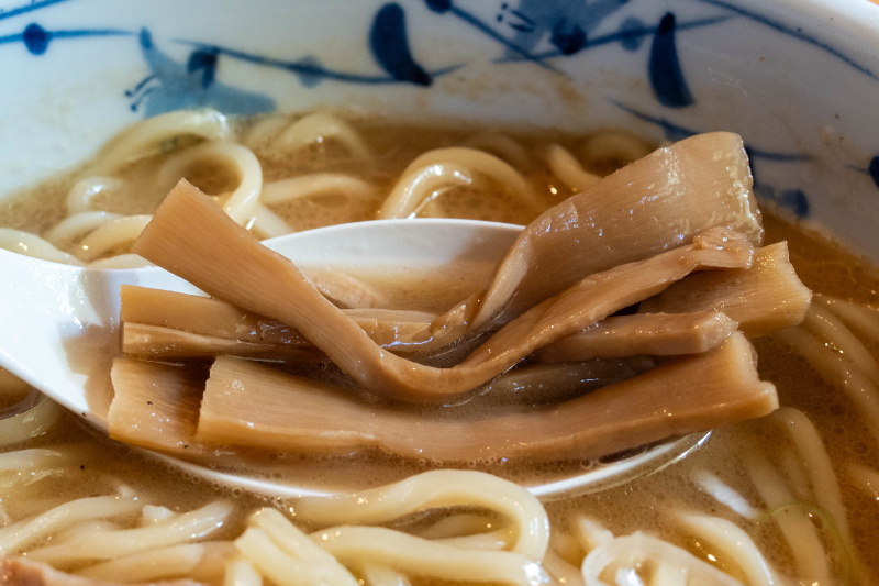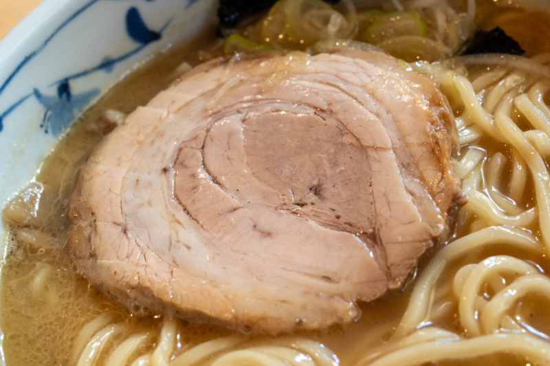 中華そば [2025/5/24] ¥1100 暖簾、トレイ、箸とも緑色系で統一されている。 動物系と煮干し・鰹節など和風乾物系のWスープ。 表面に幕が張るほどコラーゲンが染み出している。 やりすぎない濃厚感で、最後まで飽きずに食べ進められる。 たぶん無化調だろうが、十分な旨味がある、物足りなさは全くない。 味付けは醤油ベースで、適度な甘味があり、まろやかで芳醇さがある。 表面の油はほぼなしで、重たくない。 麺は中太ストレート。 適度な硬さの茹で上げで、ツルツルとした滑らかな表面に、モッチリとした食感がある。 インスタによると、ニップン北海道 100%で、浅野さん家のたまごを使用しているようだ。 スープとの一体感がある。 麺量は200gとたっぷり。 (自家製麺) チャーシューは豚バラロールで厚めのカット。下田さん家の豚で、脂の甘味と肉の旨味がある。 メンマは熟成タイプ。コリッとした歯切れ感があり風味が良い。 薬味は、長ネギの白い部分の小口切り。 懐かしさのあるWスープ。丁寧さがあり満足度が高い! |