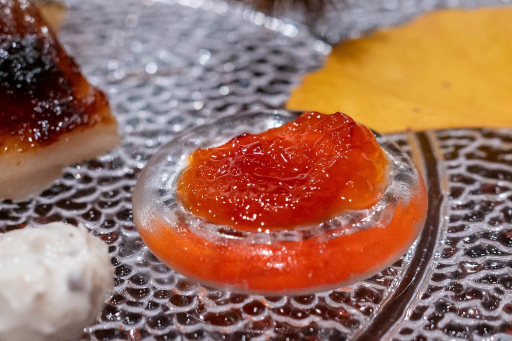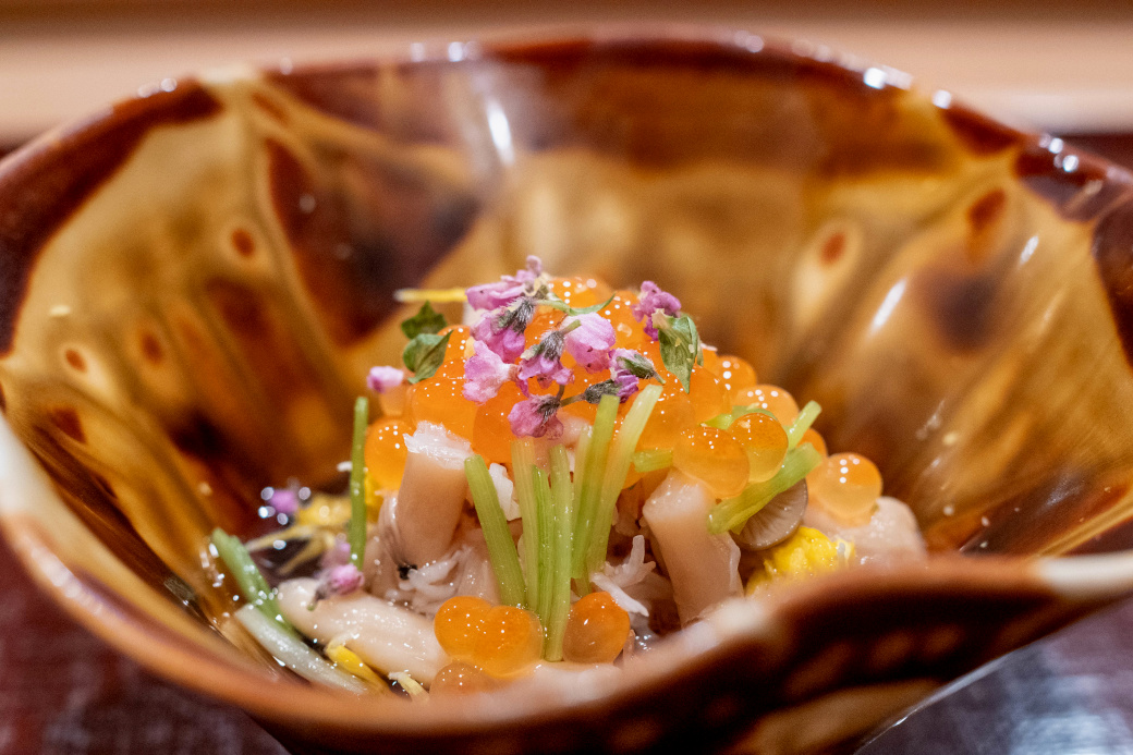 茨城県産 白魚 唐墨和え・キャビア・ペンタス(紫) |