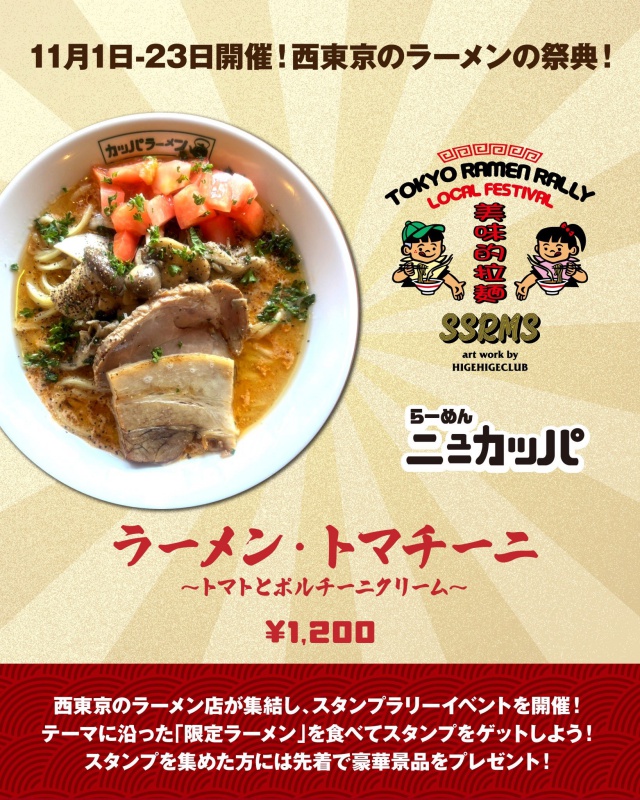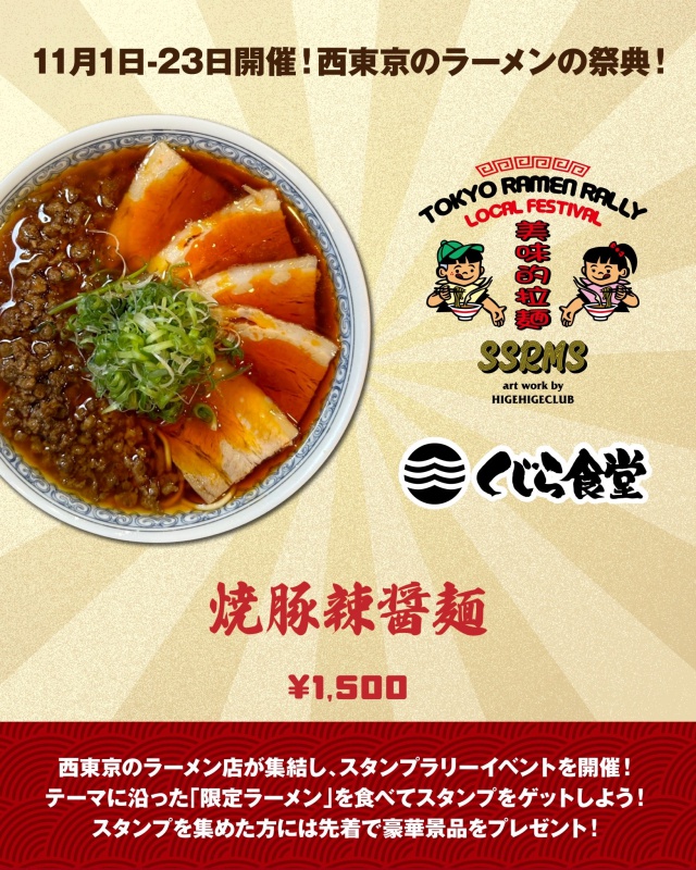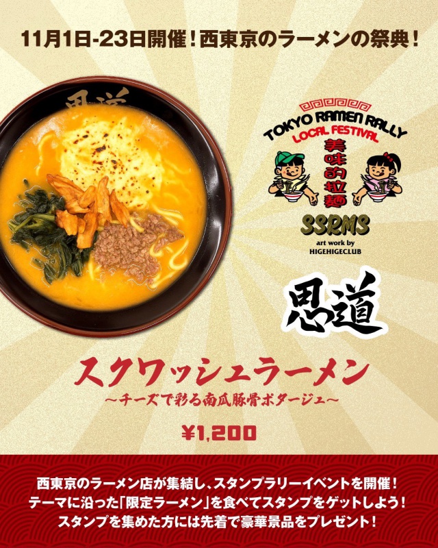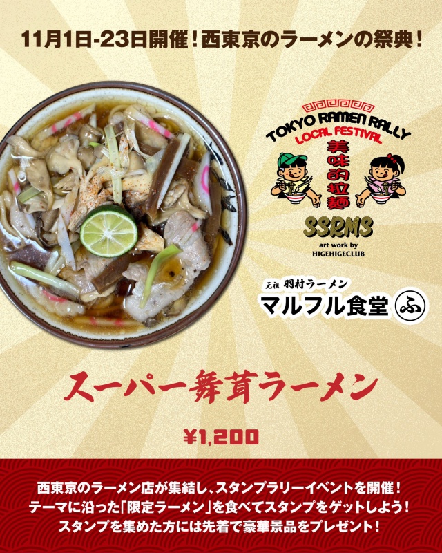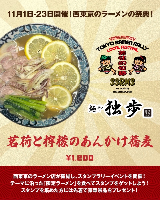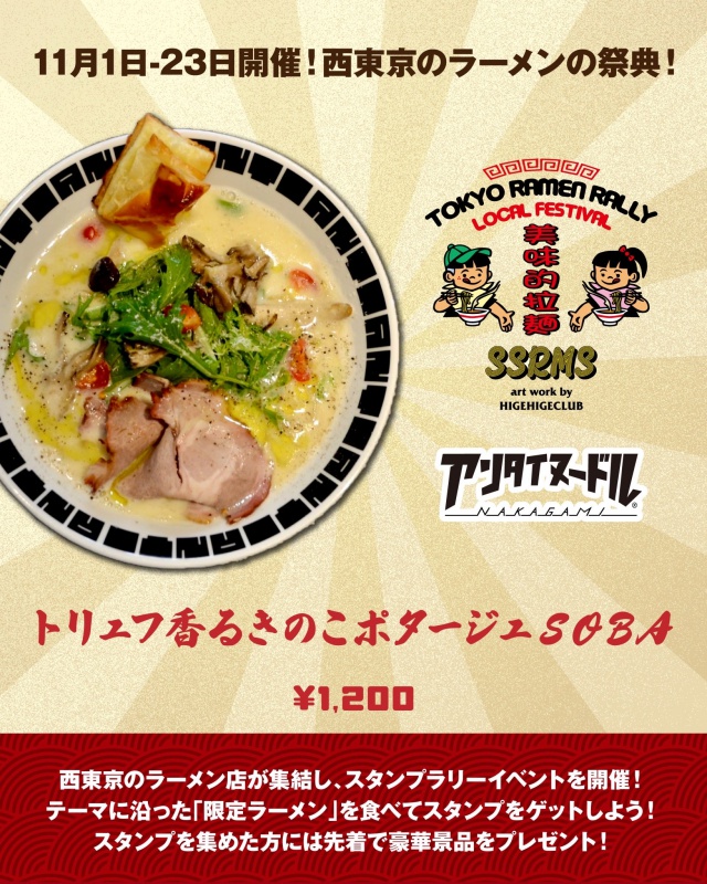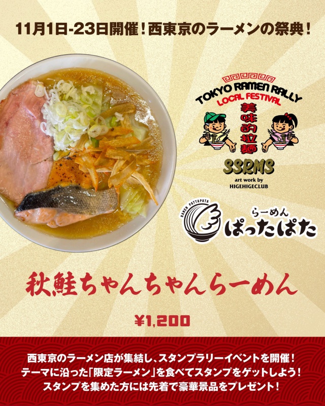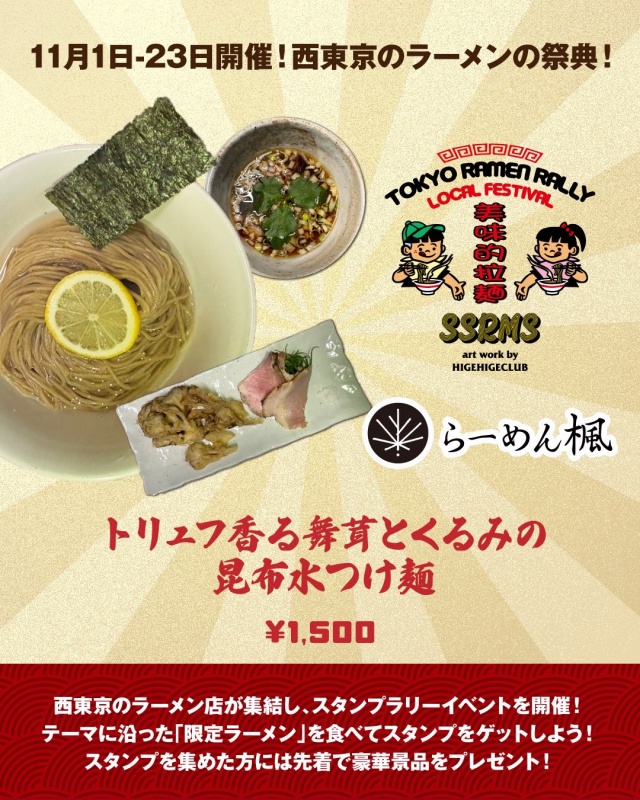 ▶ コンセプト ラーメンを通じて西東京から東京を盛り上げます! ▶ 参加11店舗で限定メニューを食べてスタンプをゲット。 提供メニューのテーマは「秋」 (詳細のルールは [公式X] [公式Instagram] を参照) ▶ 実施期間 : 2025/11/1〜23 ▶ 景品