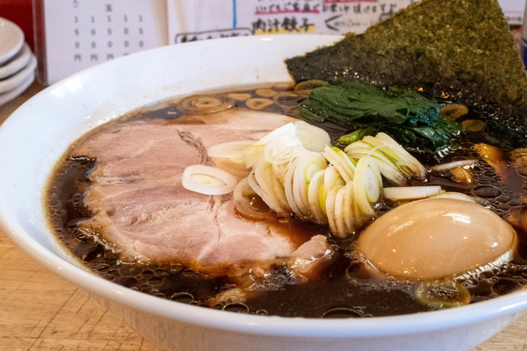 麺に味玉、茹でモヤシ、茹でキャベツなどがトッピング |