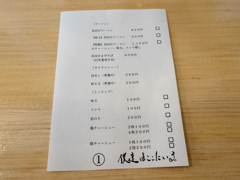 味玉貝出汁ラーメン [2022/5/25] 900 特製貝出汁ラーメン 1100 (チャーシュー、味玉、メンマ増し) 貝出汁まぜそば 900 (22年夏頃予定) 貝めし 200 (準備中) 和え玉 200 (準備中) 味玉 [2022/5/25] ・メンマ 100、岩のり 200 鶏チャーシュー 2枚 100 / 4枚 200 豚チャーシュー 1枚 100 / 2枚 200 |