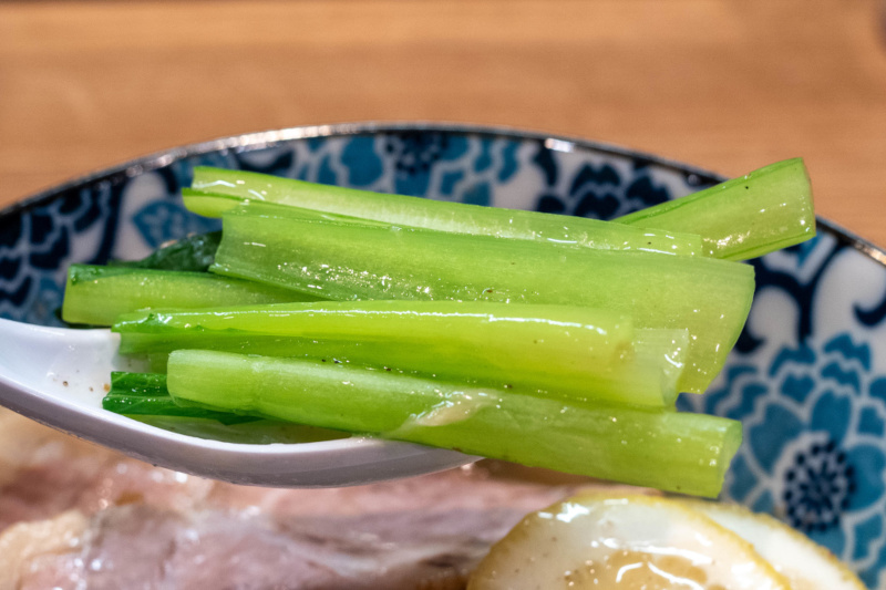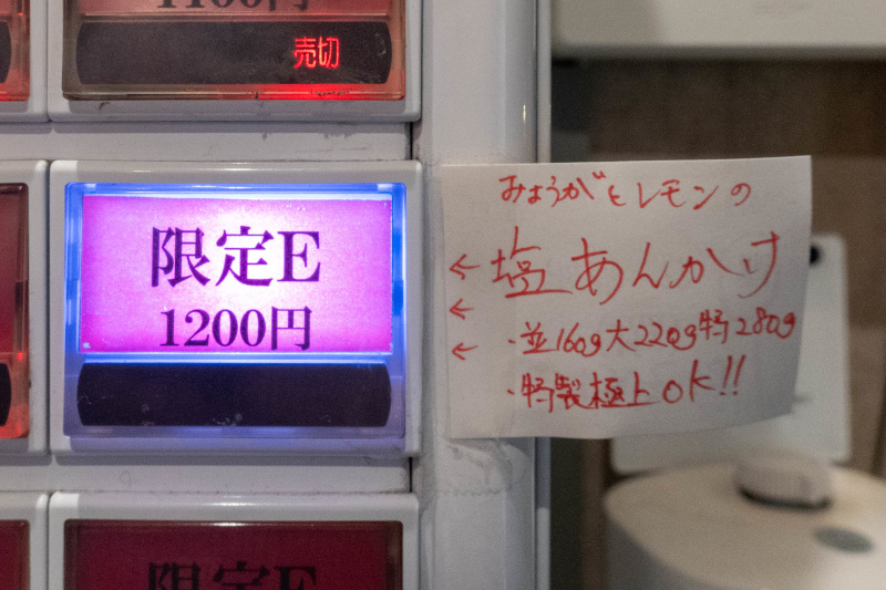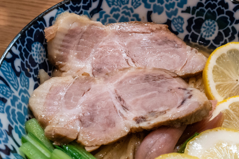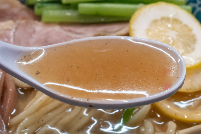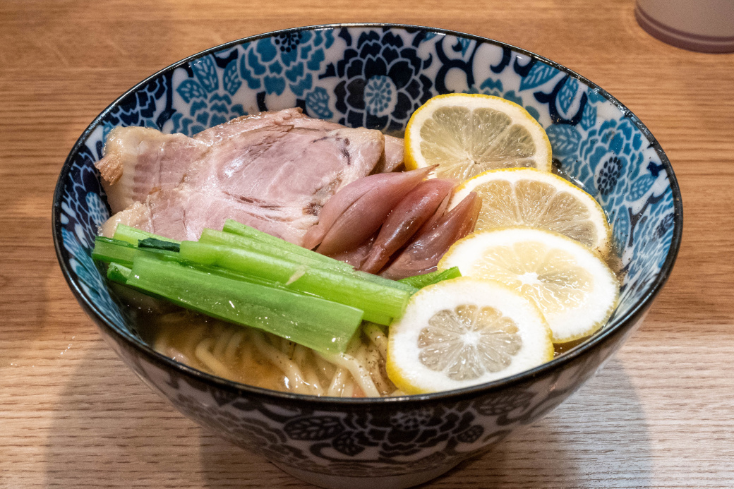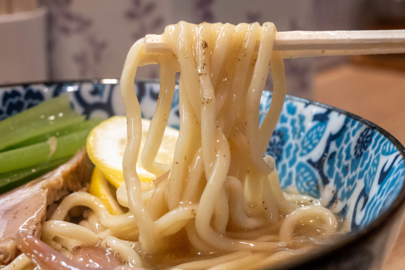 都度、小鍋であんかけを作るので熱々。 香りが高く、旨味たっぷり。 クッキリとした塩味で、ほんのりと胡椒が効いている。 甘酢漬けの茗荷と、レモンの柑橘系の香り・酸味が味変アイテム。 スッキリとして最後まで食べやすい。 麺は断面が丸い太麺、160g。 適度な硬さの茹で上げで、ツルツルと滑らかでモチモチとした食感。 スープとの相性が良い。 (「鈴めん」のはず) チャーシューは、厚めのカットの肩ロースが2枚で、肉の旨味がある。 茗荷は甘酢漬けで、味変としてちょうど良い。 レモンスライスは、柑橘系の香り・酸味が味変となる。 青菜はシャキシャキとした食感。 その他の具は、ナルトの細切り。 レベルの高い限定メニュー 冬の限定でもう一度食べてみたい! |