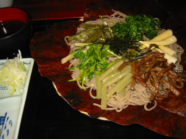 山菜6種類がトッピングされている。そばは均一の太さで、風味は少なく、短く切れた麺も多めに混じっている。ザルの上に朴葉を敷き蕎麦を盛ってあるので、水切りが不十分。山菜は苦味もあってまあまあ。