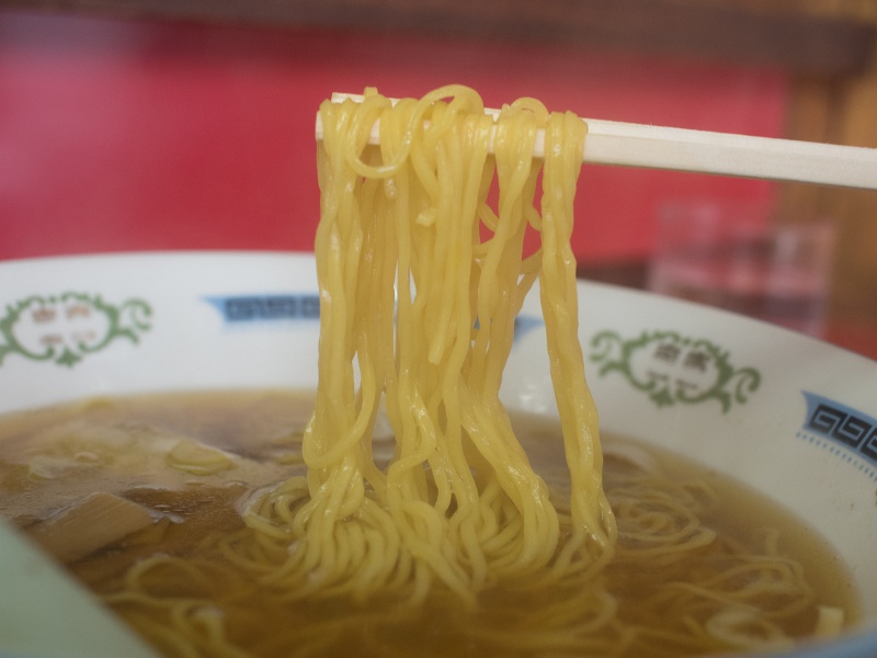 ラーメン 430円 (2015/2/23) 湯気で霞んでいる。 鶏ガラ・ゲンコツに、昆布・煮干し・鰹節などを使用した清湯スープ。 ファーストタッチで昆布が主張する昔ながらの醤油スープ 博多ラーメン並の短時間で茹であげる細麺の組み合わせ。 チャーシューはスープで茹でたもの。小さめながら厚めにカットしてある。