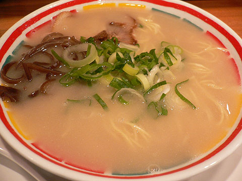 【ぼんしゃん】 \670 豚骨のエキスが良く染みだしてとろみがあり、余計な油は皆無。 麺は博多風の極細。 ネギは青ネギのほうが合うと思う。 |