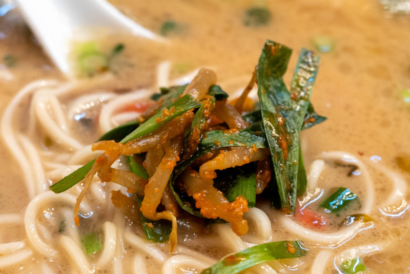 スパイスの香りが広がった後、味噌のコクと甘みが包み込む、絶妙な甘辛バランスが特徴です。 魯珈ワールドを盛り上げる具材たち! 具材は、もやし、辛子高菜、ネギ、メンマ、なると、万能ネギ、魯珈そぼろをオシャレに盛り付けています。