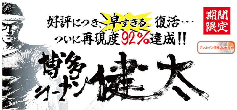 それに加えて無限替玉付きバージョンも同時発売! 君は何玉いける? 遠慮せずにいっぱいどうぞ。乞うご期待! やだ、とまらない! 旨みたっぷりのシャバシャバスープ! 好き、大好き! 今回のスープはなんと健太店主直伝の豚骨ベースの呼び戻し製法で開発!