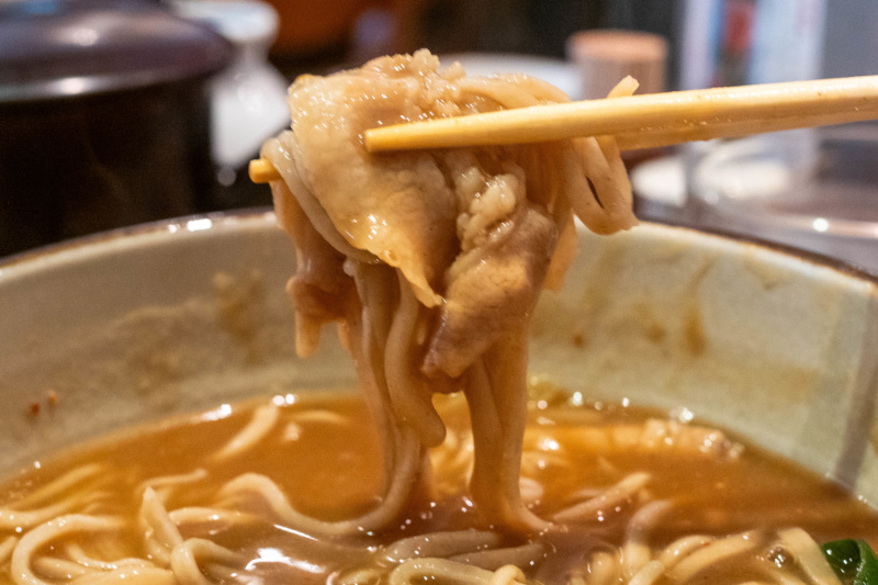 具材は、豚バラ、のらぼう菜、揚げ |
