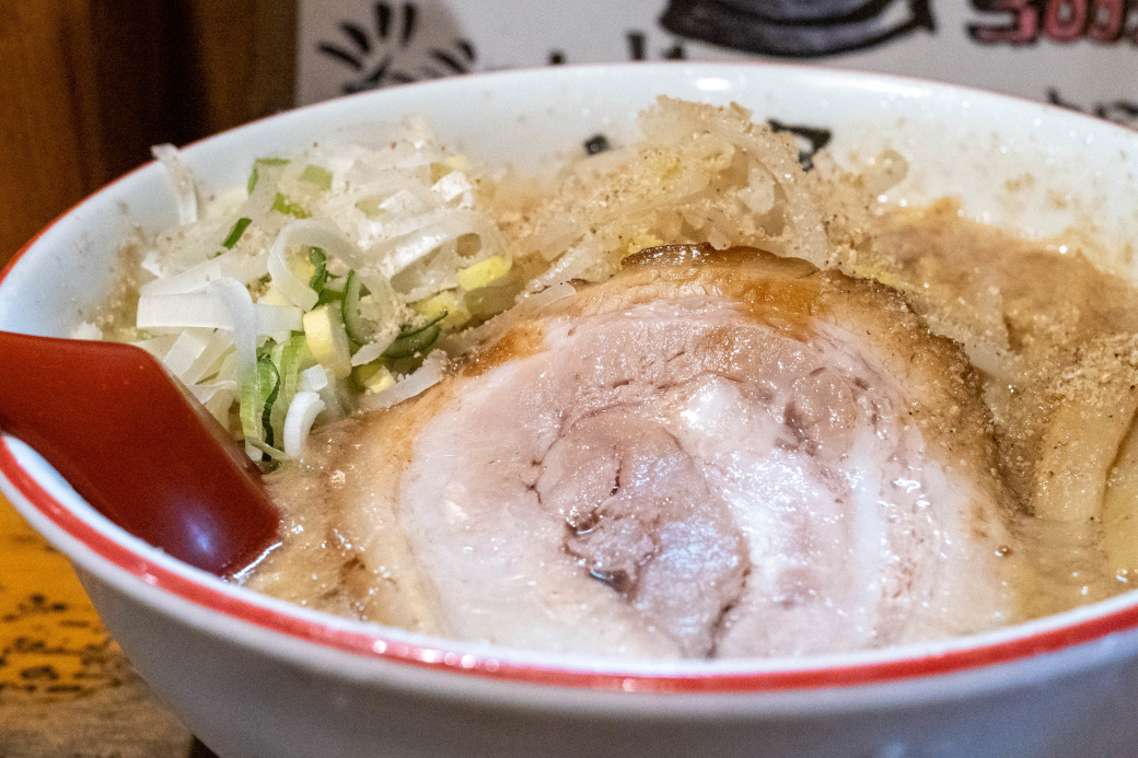 豚骨スープに大量の背脂によってドロドロになったスープは見るからにコッテリながら、しつこさは少なくまろやかさがある。 |