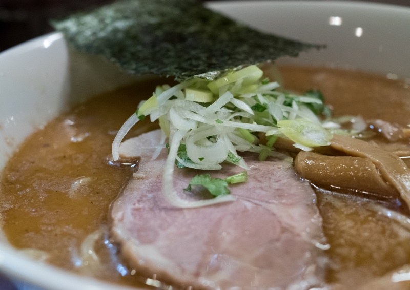 【豆しおらーめん】 [2015/4/13] ¥770 茶濁スープに見えるものの、表面を覆う和風魚系の香味油が褐色だからで、スープそのものは豆乳を使った白濁。 化学調味料未使用ということもあり、表面には適度に油が浮いているが、しつこさは感じず、見た目よりもスッキリとしている。 味付けは醤油ベースで、適度な濃さの味付け。 麺は中細の縮れ。 堅すぎない茹で方で、モッチとした歯応えがある。 (「浅草開化楼」製麺) チャーシューは肩ロースで、軟らかくしっかりとした味付けで、肉本来の味わいがある。 メンマは普通。 薬味は長ネギの笹切りと水菜。