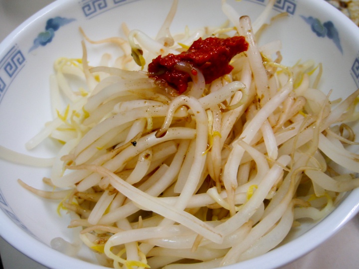 【もやし(つまみ)】 さっと茹でたもやしに辛みのある豆板醤がトッピングされている。 |