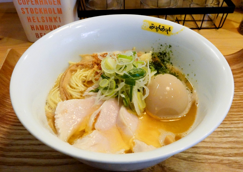【鶏白湯+濃厚味玉】 [2021/2/18] ¥750+¥100 ややとろみのある鶏白湯スープは鶏の旨味が満載で、濃厚ながらしつこさはない。 味付けはまろやかな醤油味。 ショウガとフライドガーリックが味変になる。 麺は細麺ストレートで長め。 硬すぎることなく、しなやかな食感が特徴。 スープとの相性が良い。 (田村商店らしい) チャーシューは、鶏ムネ肉の低温調理。 柔らかくジューシーで、肉の旨味がある。 濃厚味玉は、溜まり醤油に漬けたもの。 黄味がトロトロの半熟で、白身は全体的に色づいている。 濃厚でしっかりとした味付け。 メンマは穂先メンマ。 薬味は長ネギの小口切り。