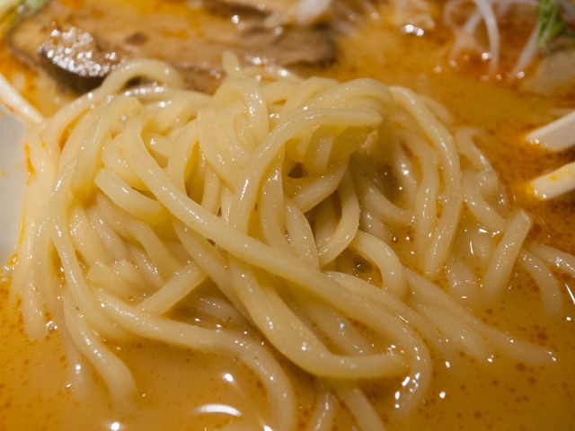 麺は中細・短めで、軽くウェーブがかかっている。やや加水が多めで、モチッとした食感がありつつ歯切れが良い。