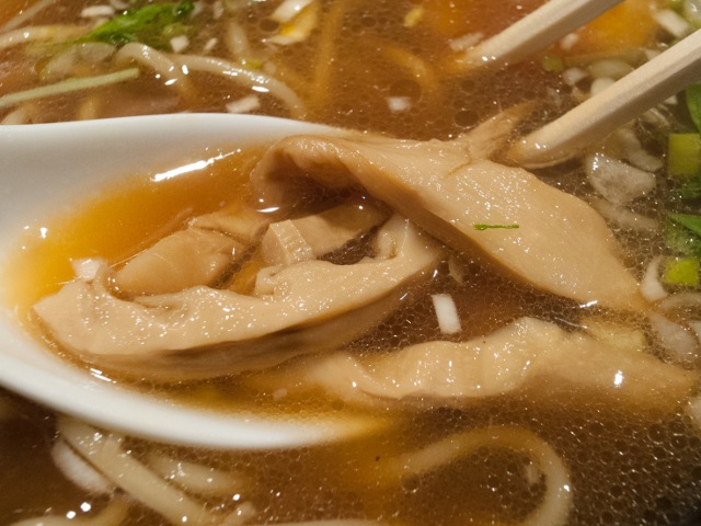 やや濁りのあるスープは、煮干し・節系のはっきりとした輪郭があり、奥に鶏の動物系を感じる。