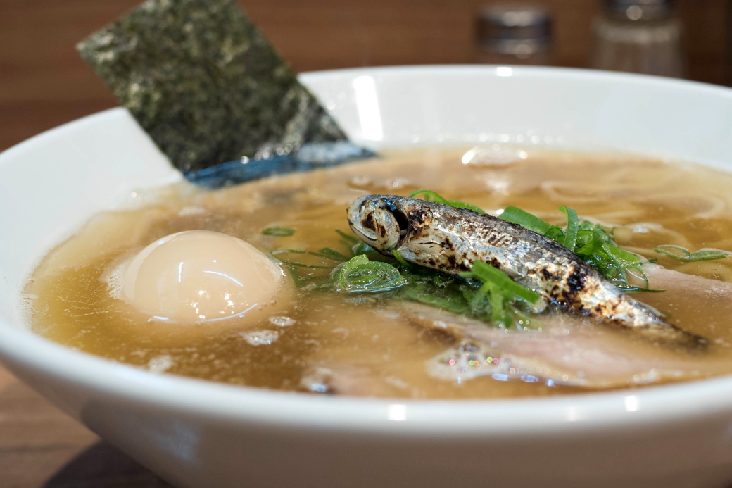 【伊吹いりこのらーめん+味玉】 [2020/11/15] ¥850+¥100 2020/11/13からの限定メニュー お店からの告知 スープは100%伊吹いりこ。 トッピングはいつもと同じですが伊吹産の釜揚げいりこ(干す前の煮干し)を軽く炙って乗せてます。 麺は平打ち縮れ麺。 いつもの煮干しスープは苦味やエグミを出さないように気をつけてますが、今回はわざと苦味やエグミを出してます。 |