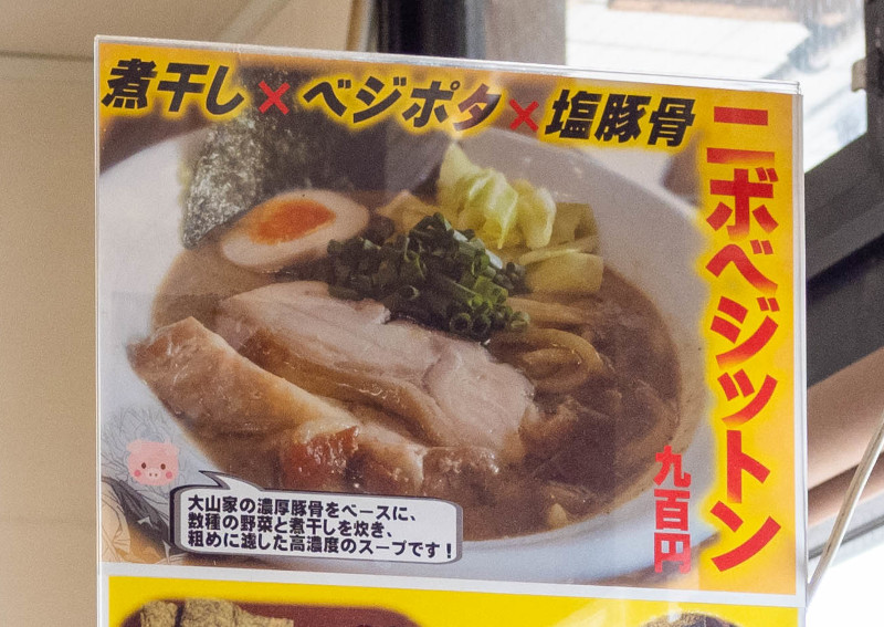 大山家の豚骨で数種類の野菜と煮干しを炊きあげ、粗めに濾しました! 素材の味を凝縮した高濃度のスープで極太麺を絡めてお召し上がりください。 |