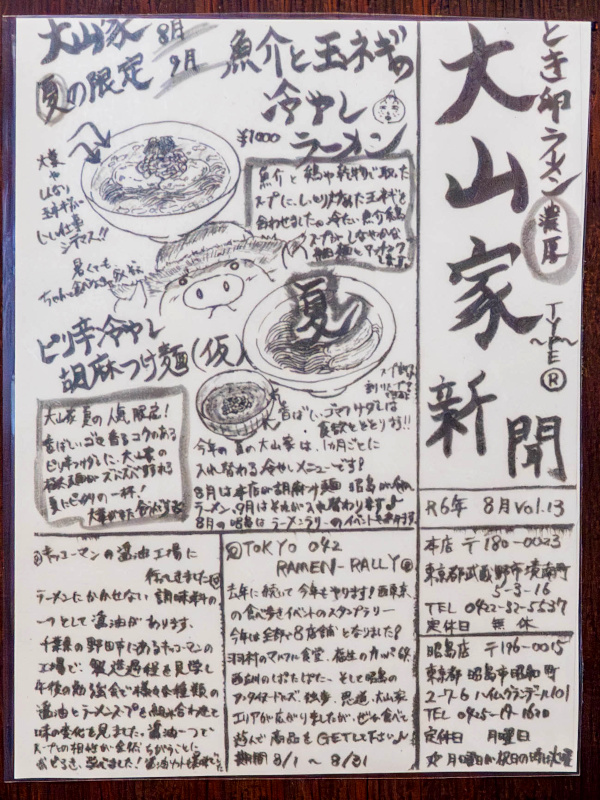 大山家新聞 Vol.17 R7.11月 (画像は公式Xから引用) 11月限定 秋のとき卵ガッツリBLACK 1200円 ▶ 秋の食材 サツマイモとしめじのトッピング! スパイシーでしょっぱめのブラックスープに、サツマイモの甘さがマッチ ▶ 3種の醤油と焦がしネギブラックペッパー油が刺激的なブラックスープに さらにブラックペッパーをたっぷりと大山家らしくとき卵仕立て! ▶ ワイルドチャーバーグはどどん!と2枚!! 食べ応えたっぷりで食欲の秋にピッタリ 大山家の黒シリーズは、黒いとき卵ラーメン、黒いときVer、大山家ブラック・ザ・ワイルドなどがありましたが、今回久しぶりの登場です! 今まではネギがいい仕事をしてくれましたが、今回は秋の麺をコンセプトにサツマイモを合わせました。 ワイルドチャーバーグも、今回作り方を見直して、より美味しくできたと思います! ぜひご賞味下さい。 |