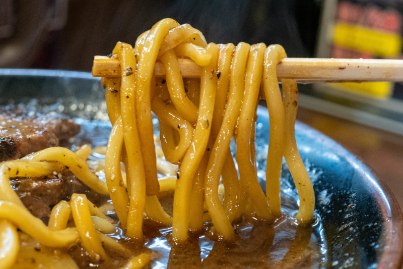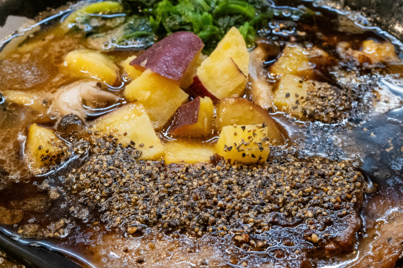 ベースはとき卵ラーメン。 ややとろみがあるしっかりと煮出された濃厚豚骨スープ。 そこに特製黒ダレ(焦がしネギ油とのこと)と、大量のブラックペッパーをプラスしてありスパイシー。 濃いめの味付けなこともあり、インパクト大。 麺は太麺で軽くウェーブがかかっている。 やや硬めのモッチリ感のある食感。 濃厚なスープに負けていない。 (山正食品) チャーシューはチャーバーグが2枚。柔らかく、肉の旨味があって美味しい。 サツマイモはサイコロ状で、甘味が箸休めになる。 しめじはソテーしてあり、秋らしい味わい。 ほうれん草は柔らかい。 ジャンキーなブラックラーメン! |