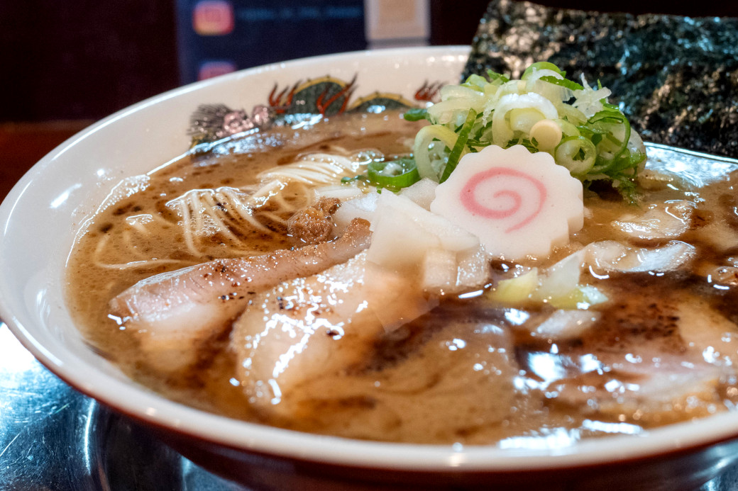 熱々のスープは豚骨魚介で、鰹節などの節系がクッキリ濃厚。 |