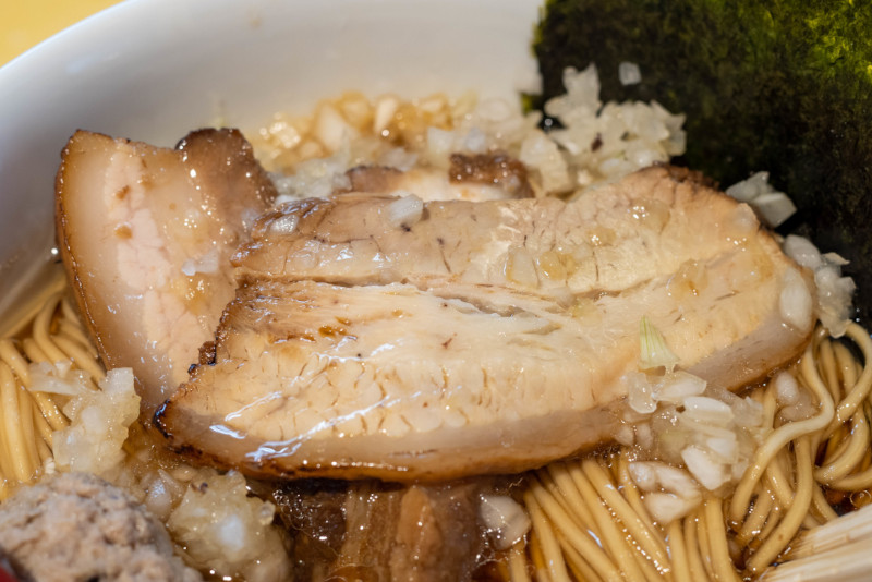 チャーシューの煮汁を醤油ダレにして、麺の茹で湯で割ってスープにするという、竹岡式と同じ作り方。 |
