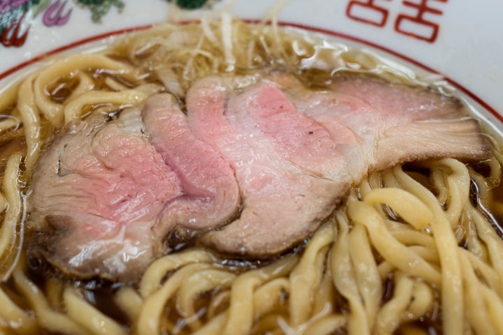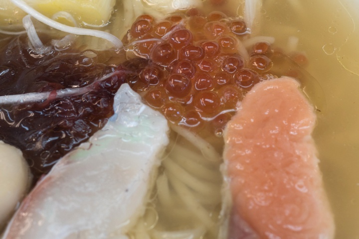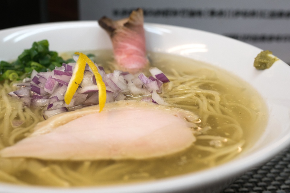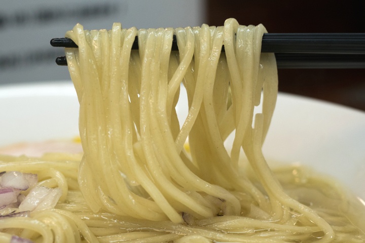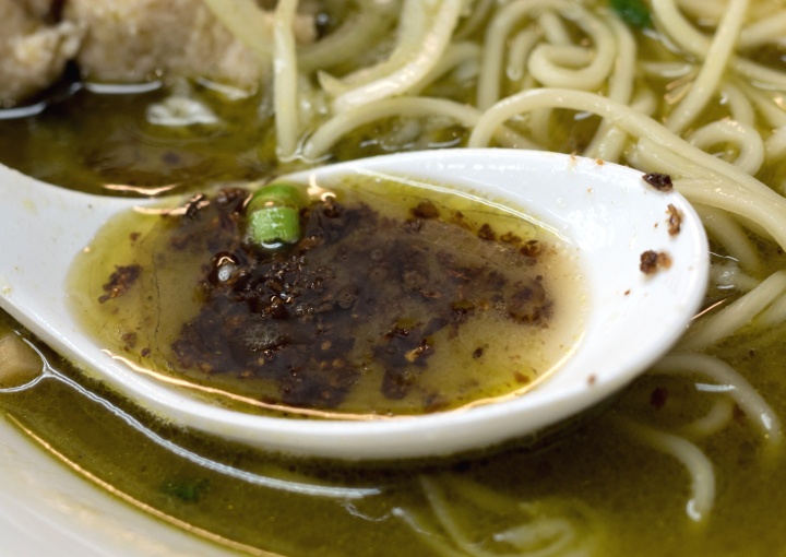 透明感のあるスープは、魚介、貝、鶏の3種類のブレンドスープで、素材の織りなす深みがあり、化学調味料未使用らしい優しい味わい。 |
