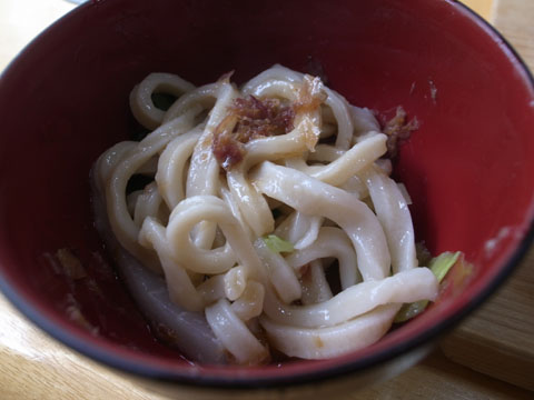 お椀に、削り節を入れ醤油をかける。 そこに熱いうどんを入れて、混ぜて食べる。