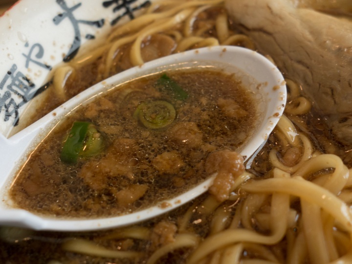 低加水で堅すぎない茹で方で、サクッとした歯切れ感と、しなやかな喉越しが心地よい。 時間が経つと、麺が濃いめの醤油スープ染まってくる。