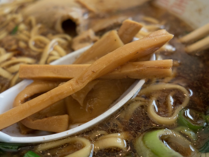 チャーシューはモモ肉2枚で、薄めながら大きめにカットしてある。軟らかくて薄めの味付け。