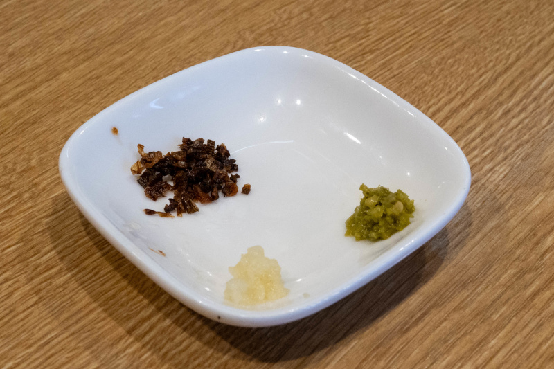 3回、味を楽しめます ①そのままで ②柚子胡椒を入れると味がピリッと締まります ③ごま油で揚げた、ニンニク・ねぎを入れると香ばしくなります お好みでお楽しみ下さい ▶ 正油つけめん
