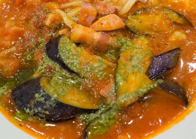 【ベーコンと茄子の濃厚トマトスープ麺】 |