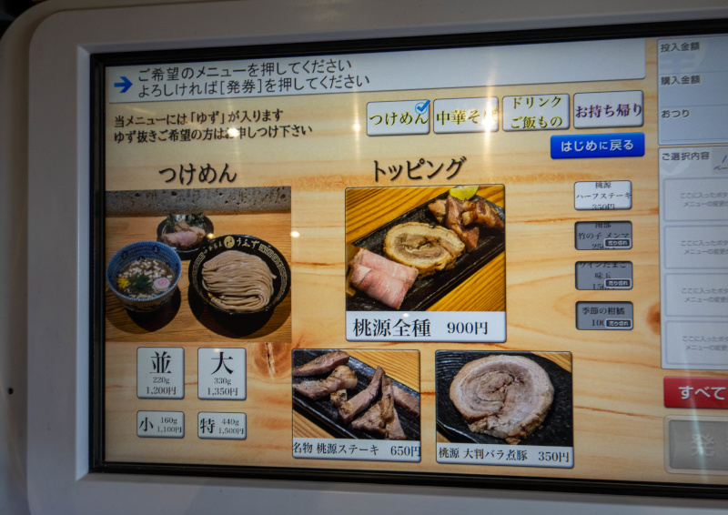 つけ麺 小 160g 1100/並[2023/4/11] 220g 1200/大 330g 1350/特 440g 1500 中華そば 小 130g 1000/並 180g 1100/大 260g 1250/特 350g 1400 桃源ステーキ 650/ハーフステーキ 350 桃源大判バラ煮豚 350 桃源全種 900 (吊るし焼き・大判バラ・肩ロースステーキ・ウデ肉) ワインたまご味玉 150、南部 竹の子メンマ 250、季節の柑橘 100 吊るし焼きごはん 600・小 550 ホイコロごはん 500・小 450 おんたま 150(ご飯用トッピング) 白米 250・小 200 【テイクアウト】