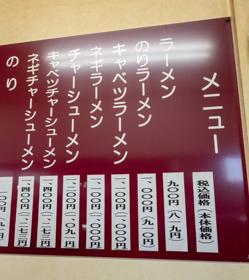 ラーメン 900、のりラーメン 1000、キャベツラーメン 1100、ネギラーメン 1100、チャーシューメン 1200、キャベツチャーシューメン 1400、ネギチャーシューメン 1400 辛子味噌ラーメン 1000、辛子味噌キャベツラーメン 1200、ネギ辛子味噌ラーメン 1200、辛子味噌チャーシューメン 1300 中盛 +150、大盛 +300 のり・半熟味付け玉子・ニラ・もやし・コーン・うずら玉子4個・メンマ 100 餃子 500 ミニチャーシュー丼(辛子味噌キャベツ丼・ネギチャーシュー丼) 400、ライス 300・小 200