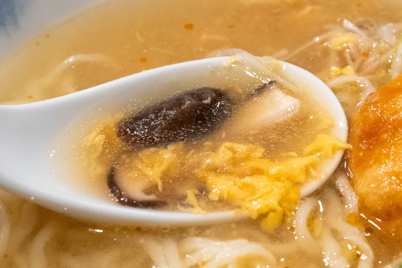 スープの半分をとろみをつけたスーラータンメン風にしたユニークな一杯。桜エビの香りと甘味、ラー油やエビ油などの程よい刺激と酸味が絶妙に絡む |