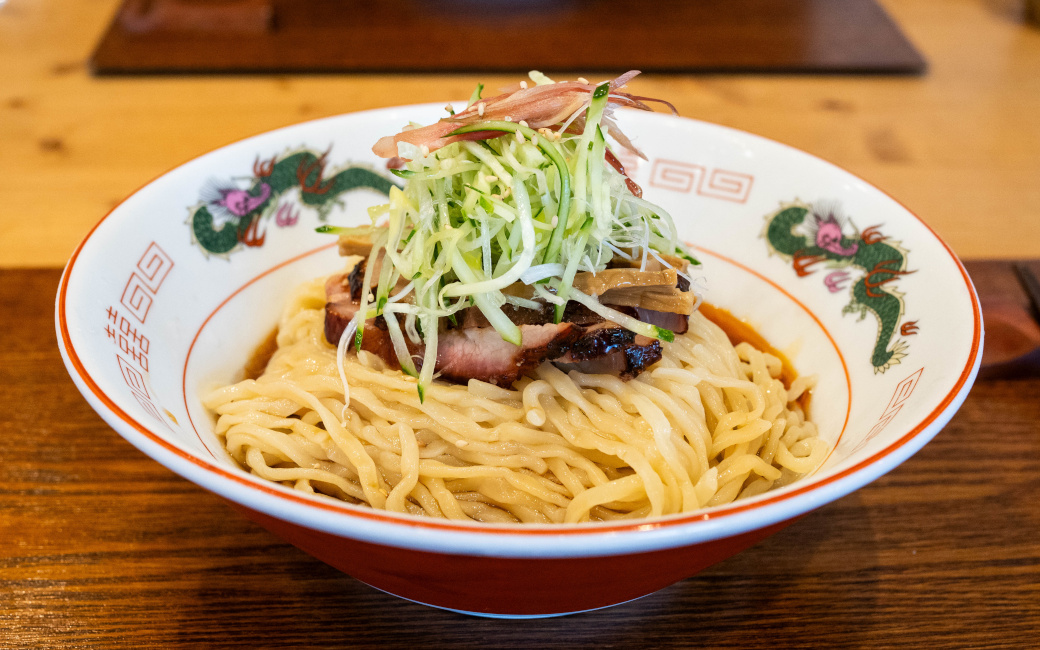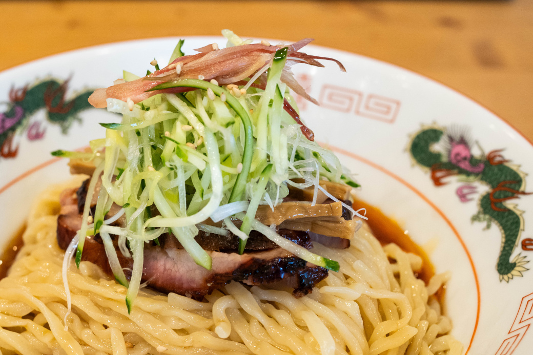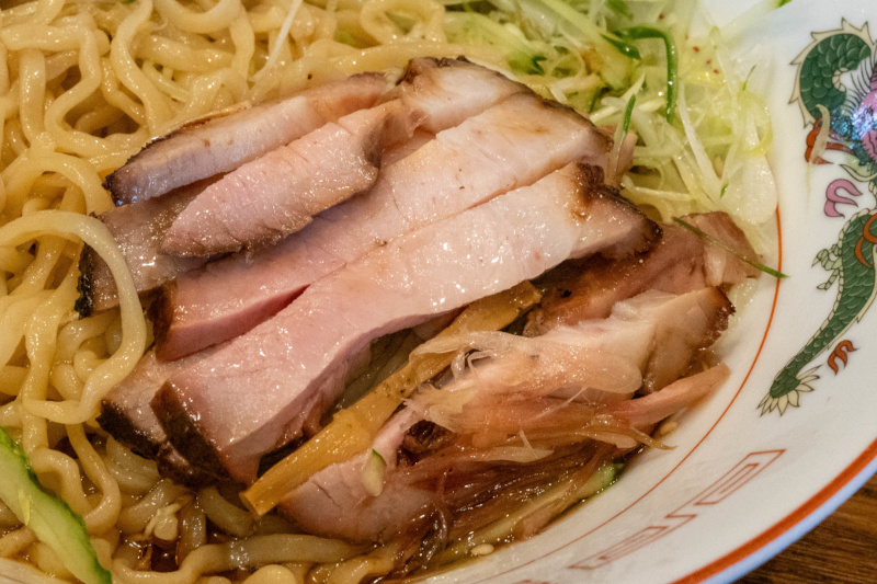 『お肉がメインの冷やし中華』とのこと。 麺は太い手揉み麺。 水で〆てあり、ツルッと滑らかで、プルッ・モチッとした弾力のあるモッチリとした食感。 小麦の香りが心地よいので、麺そのものが美味しい。 (自家製麺) 麺を丼の底にある内堀醸造の黒酢を使用したタレとよく混ぜて食べる。 まろやかな酸味と旨味のタレは多少のピリッと感があって美味しい。 チャーシューは諫美豚(かんびとん)の、分厚いカットのバラが2枚で、1枚はロールタイプ。 自家栽培したお米を与えて飼育しているためか、クセがなくスッキリとした旨味がある。 直前に炭火で炙ってあるので、香ばしさがプラスされてさらに美味しい。 冷やしワンタンは、海老ワンタン・肉ワンタンが1個ずつで、冷やしても美味しい。 夏野菜の焼き浸しは、パプリカ、南瓜、茄子、オクラ、茗荷。野菜の食感と旨味を残してある。 その他の具は、キュウリの千切り。 『お肉がメインの冷やし中華』というコンセプトが良くわかる 食べたこがない肉の美味しさ! |