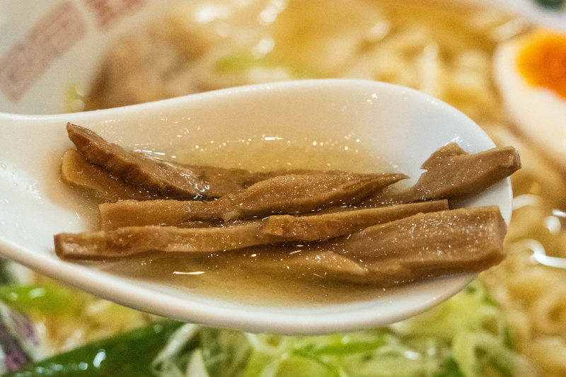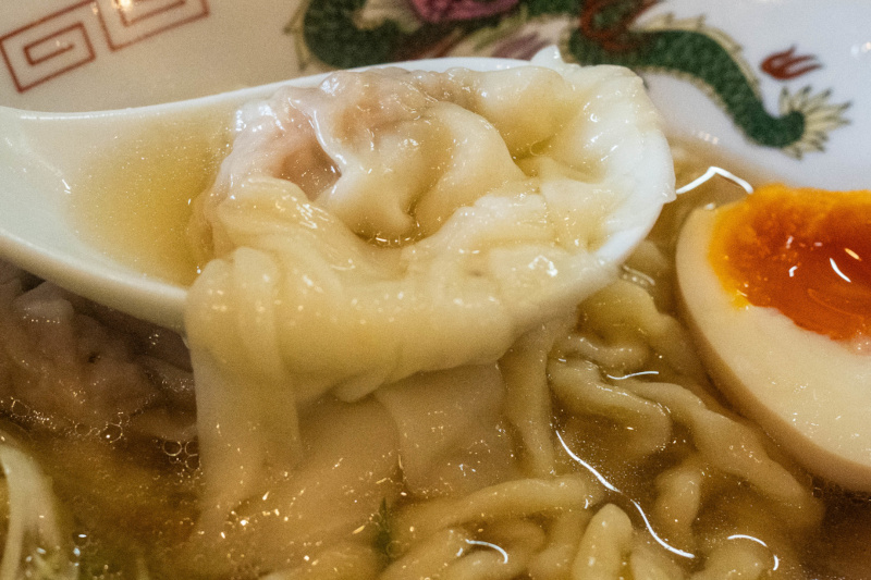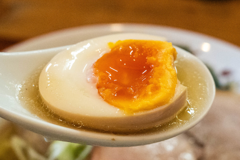 煮干しの柔らかい香りと甘味のスープは、じんわりと旨味が広がる。 雑味は皆無で、旨味だけを上品に抽出した印象。 まろやかな塩味で、ダシ感が良くわかるちょうど良い濃さ。 表面に油(鶏油?)が浮いているが、しつこさは感じない。 柚子皮が柑橘系の穏やかな味変になる。 麺は太い手もみ麺で、手もみならではの口当たりと、モチッとした食感。 小麦の香りと甘味があり、麺そのものが美味しい。 (自家製麺) チャーシューは2種。 シキンボは焼豚。厚みのあるカットで甘味のある味付けで、肉の旨味を堪能できる。 肩ロースは厚みのあるカットで、肉の旨味が満載。 味玉は名古屋コーチン。黄身がトロッとした半熟で、白身は全体的に薄らと色づいている。薄味で玉子の旨さを堪能できる。 ワンタンは海老で2個。海老の旨味とツルンとした皮が柔らかい。 メンマはコリッとして風味が良い。 その他の具は、風味の良い海苔。 薬味は、長ネギの白い部分のみじん切り、青い部分の笹切り。 煮干しの旨味を十分に引き出した一杯 |
