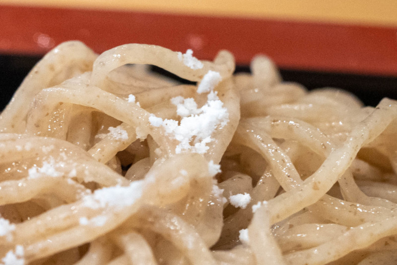 水で〆た麺は二段のせいろに盛られ、上の段は細切り、下の段は平打ち。 |